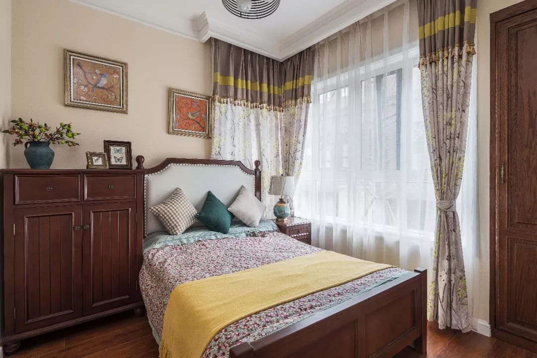 次臥面積相對較小,將一側床頭柜換成了頭柜,不影響美觀,也很實用。