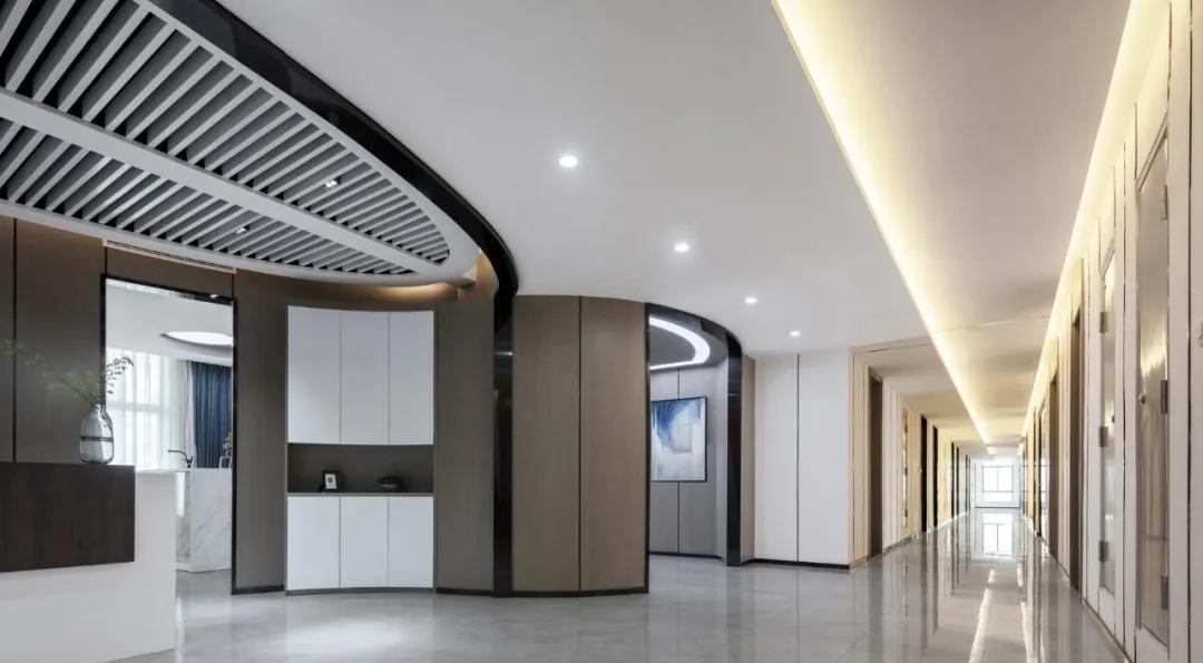燈光設計是體現設計靈魂的手段,走廊的燈光是本案設計的一大亮點,暖色的燈帶恰到好處地點綴在走廊墻壁內,一扇一扇的墻體,通過燈光的反射,錯錯落落都亮了起來,另一面墻面造型采用規律的線條裝飾,延伸了走廊空間,辦公區分別規劃在走廊的兩側,使整體空間區域井然有序。