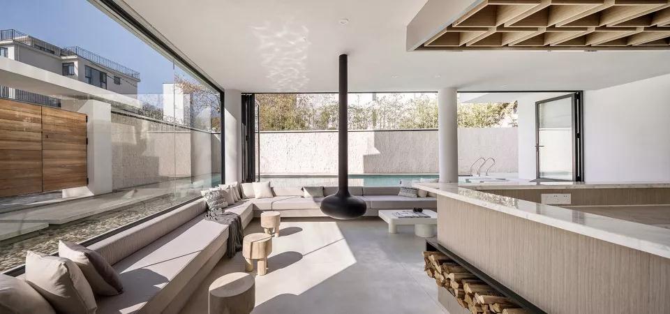在設計下沉式庭院時,很多人都會選擇半封閉性設計,采用具有防水、隔熱功能的透明玻璃,再搭配木質或金屬橫梁作為支撐,從而營造出更為靜謐的空間。