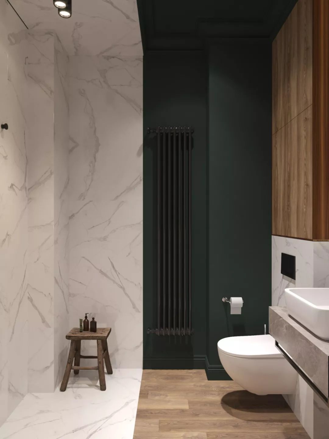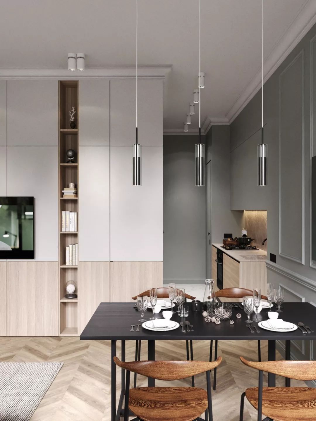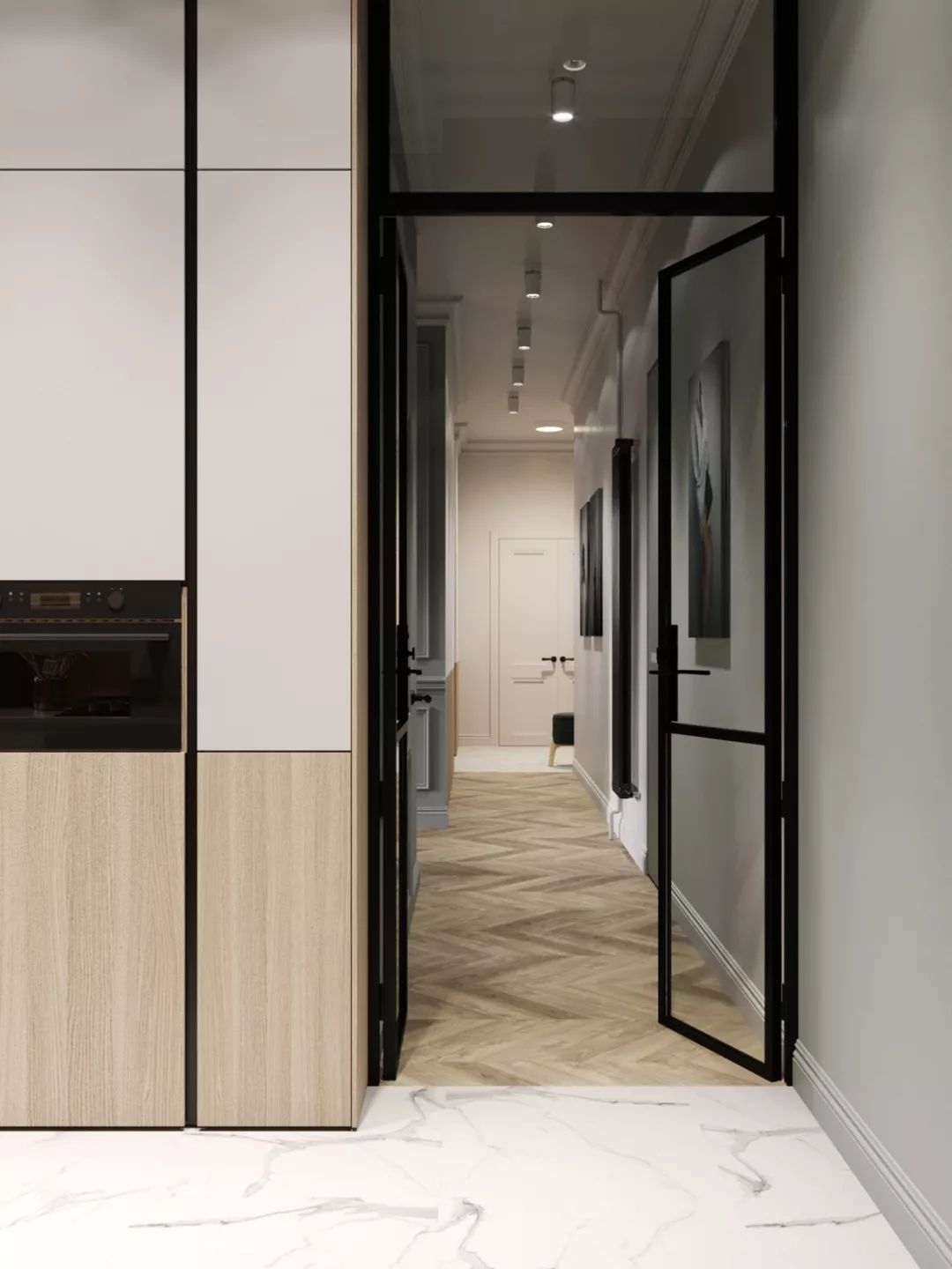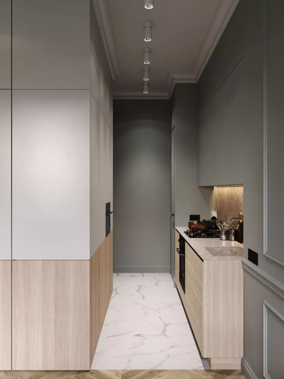 通過(guò)冰灰色天然石材與胡桃木紋路的混搭