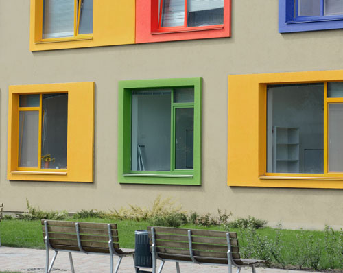 Here, the palette is used to transform a school’s facade. Neutral Pebblebrook is used as a base with eye-catching window frames in the palette’s primary and secondary hues.